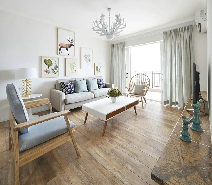 1、原木色系的欧式风格很清爽,也很自然感。花束和抱枕等的颜色点缀,又增加了些许活力