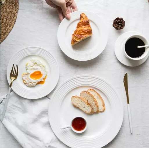纯白的盘身,边缘有着细腻纹理的浮雕螺纹盘,色泽光亮,简约又大气,优雅的圆形盘型,线条流畅,触感舒适,使用方便,还有隔热的底座,贴心的设计不易烫手,也不易弄脏桌面,不仅方便摆放各式各样的美食,而且装早餐和意面都很合适。