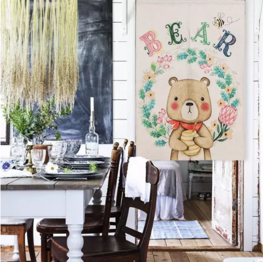一款好的门帘不仅很好的隔断了餐厅与客厅的空间,还能装饰整个餐厅环境。这款卡通动物系列的门帘。采用环保活性印染技术,让图案色彩鲜亮均匀,将活泼可爱的小熊印染的活灵活现。优质的混纺面料,带来柔软舒适的触感,不易起皱的材质特性,赋予它自然的垂感,加上细腻的针脚密缝,使得这款门帘更加精致。