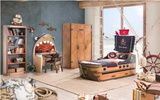 这间儿童房设计的独特之处,在于床化身成了船只,小书桌打造成了鲨鱼的造型,其他的家具也是做旧的风格,再配合绳子、船舵、地球仪等配件的装饰,仿佛我们就是身处于大海深处的一座小岛上。船长,你准备好了吗?