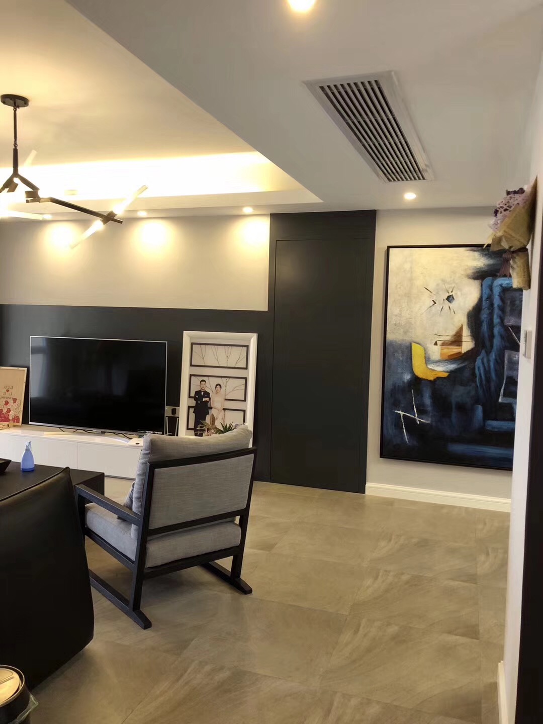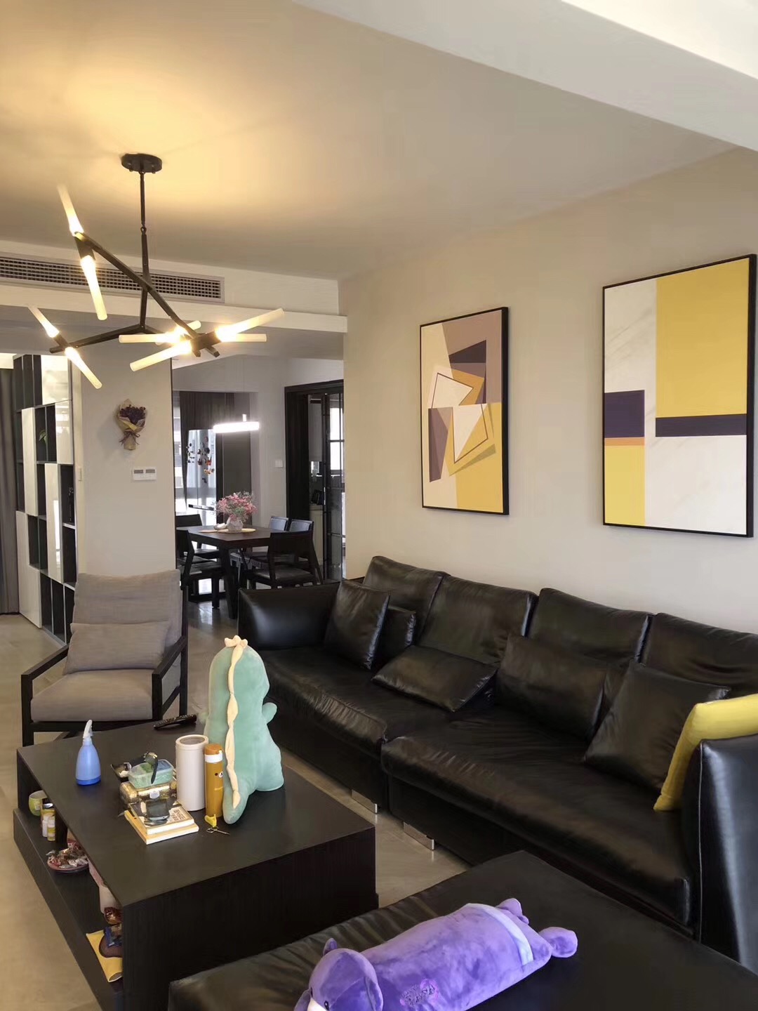 4、艺术造型灯和亮黄色的装饰画为客厅加分