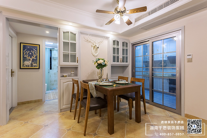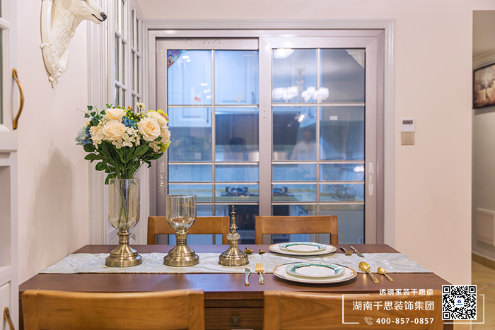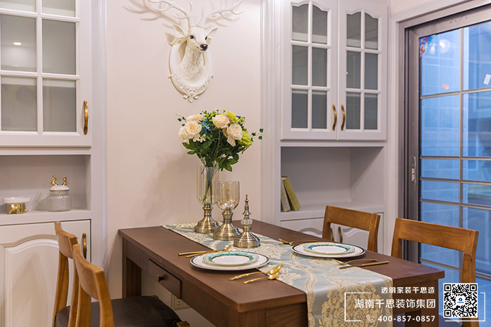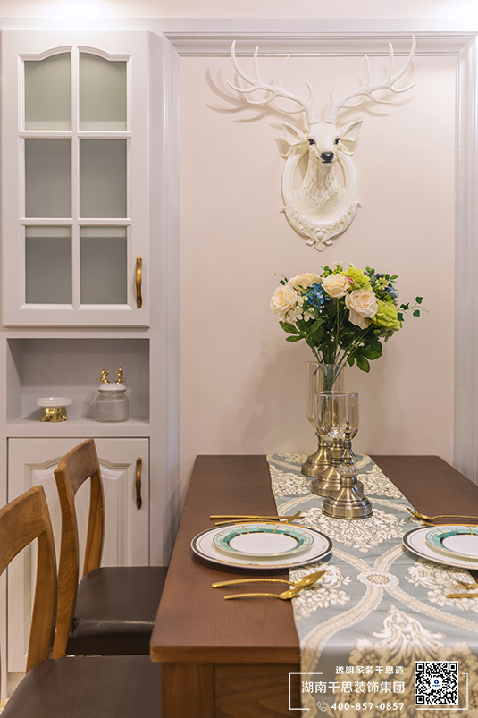 为了提升用餐气氛,设计师在墙面上做了一番处理,立体鹿头装饰,金属花瓶烛台,让不大的餐厅别有一番风味。