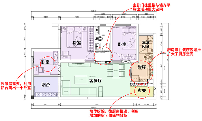因为户主张太太个人喜欢做饭,加上家里又有一儿一女,于是设计师将户型空间做了调整: