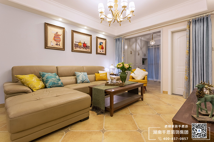 姜黄色蓝色刺绣靠枕,五彩斑斓的装饰画让客厅少了几分沉闷,多了几分活泼有趣,孩子们可以在沙发上嬉戏打闹。