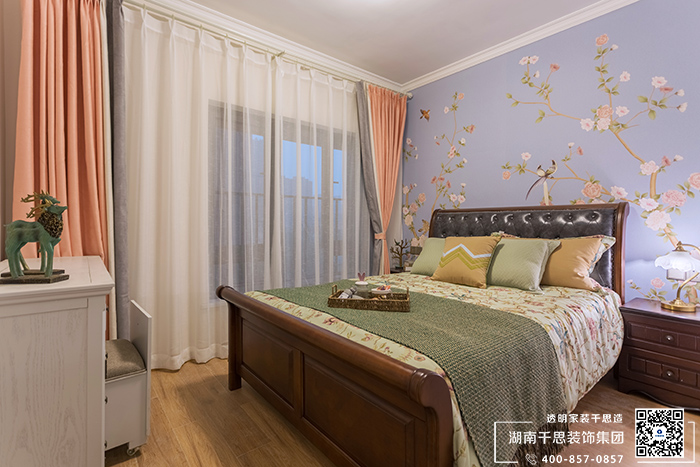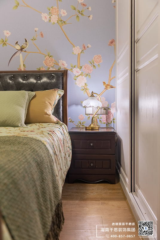 相比客厅,卧室的颜色更加丰富,淡紫色印花壁纸与浅绿色床上用品相呼应,温馨又田园,让人身心放松。
