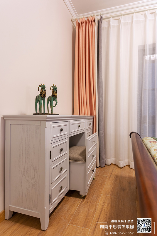 床对面放了一个简约木质收纳柜,也可作为化妆柜使用。