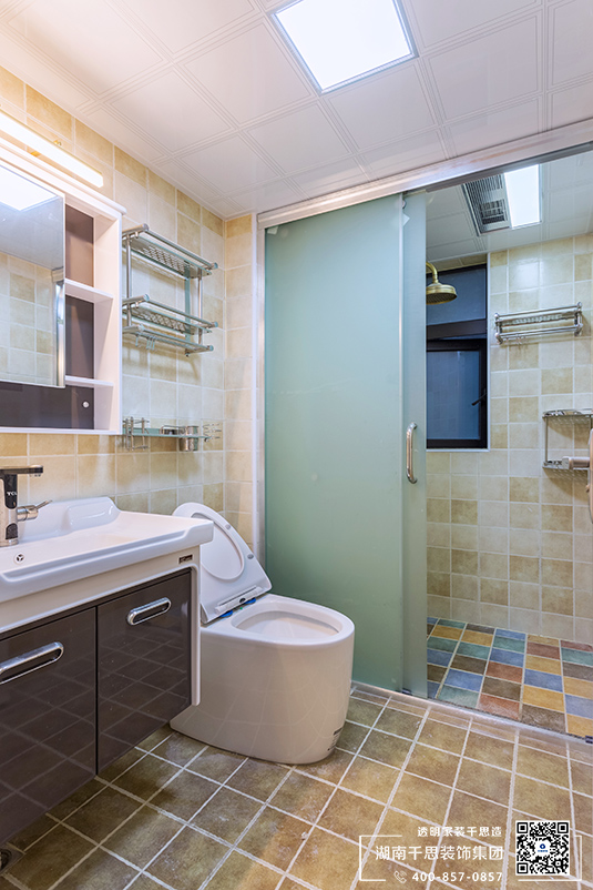 卫生间做了干湿分离,彩色地砖让洗澡变得更加有趣。挂壁洗手池方便户主清理地板,避免脏污堆积。镜柜设计则利用了纵向空间,实用美观两不误!