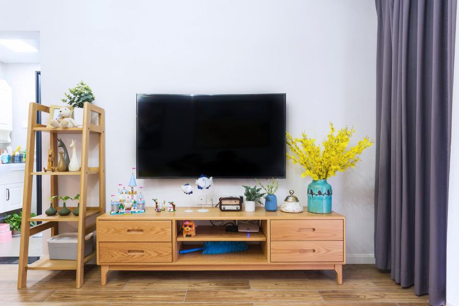 电视背景墙没有做特别设计,简单的大白墙干净利落。木质电视柜配上同色花架,弱化了白墙的单调无趣感,让客厅看起来生机勃勃。