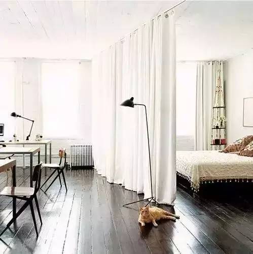 作为一种软隔断,色泽美丽的帘幕将空间分割成几个不同功能的小空间。如有需要,布帘隔断就可以随意开启,是弹性隔开卧室睡眠空间和公共空间的理想形式。