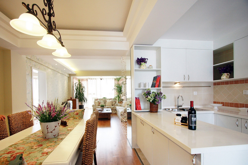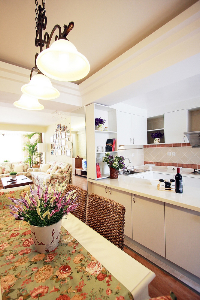 田园碎花的墙纸也成了我们客厅区的点缀,藤制+碎花布艺餐椅,餐桌上的一束花,餐边柜上花环造型的时钟,构成了我们的田园温馨美家。