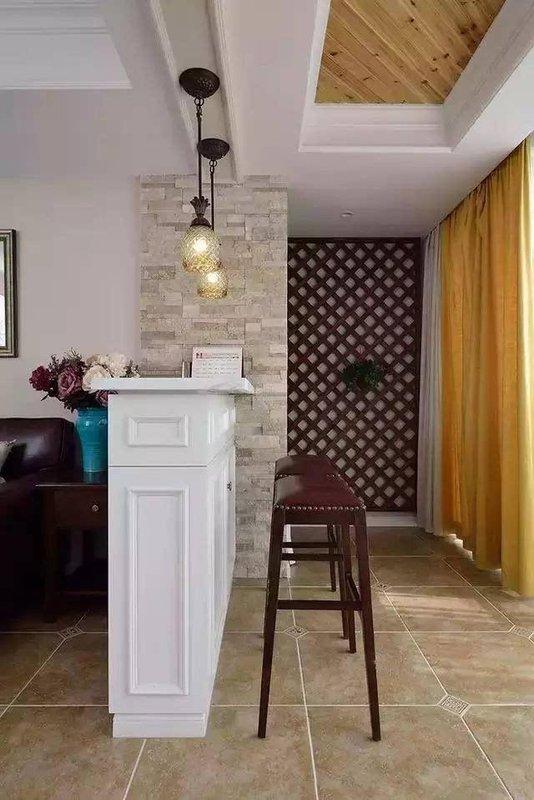 生活的浪漫,可以表现在细节处。在客厅阳台位置,利用半高隔断,打造成一个小吧台,就可以让家多几分浪漫。小吧台占用空间不大,只需要一个宽度大概30cm左右的空间就可以了,配上好看的吊灯,小吧台也有大情调。