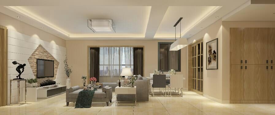 本次设计采用:本案在设计手法上用线条、色块来进行区分点缀,突出简洁、自然、人性化的特点。整体色调以暖色调为主,面板运用原木色配以米黄色的墙漆,辅助光源用的暖白的灯带,创造一个温馨,健康的现代家庭环境,从全局出发,而不仅仅着眼某一点或某一个墙面的装饰。作为横向布局的客餐厅,家具用的是简单、大气的现代组合是沙发,配以亮面的茶几、电视机柜。家具及窗帘用的较深的颜色,以达到在色彩上的对比及点缀。