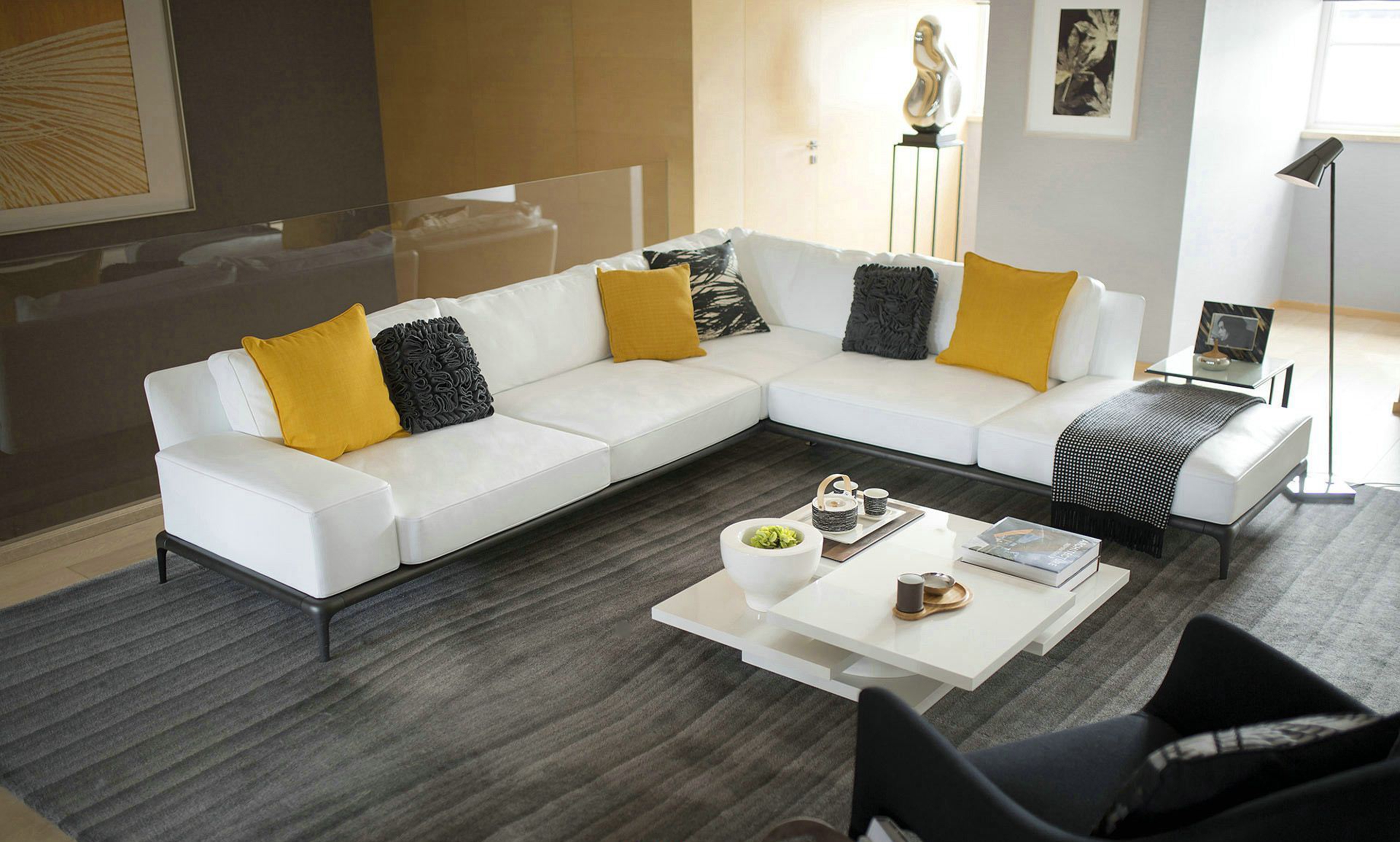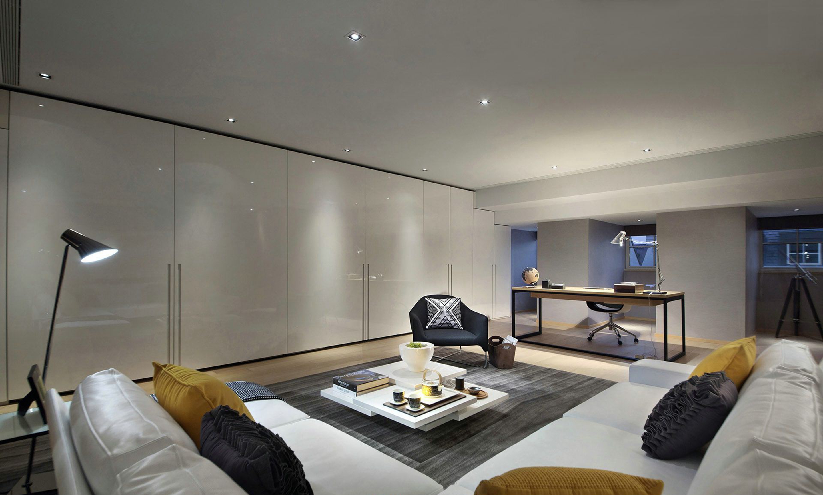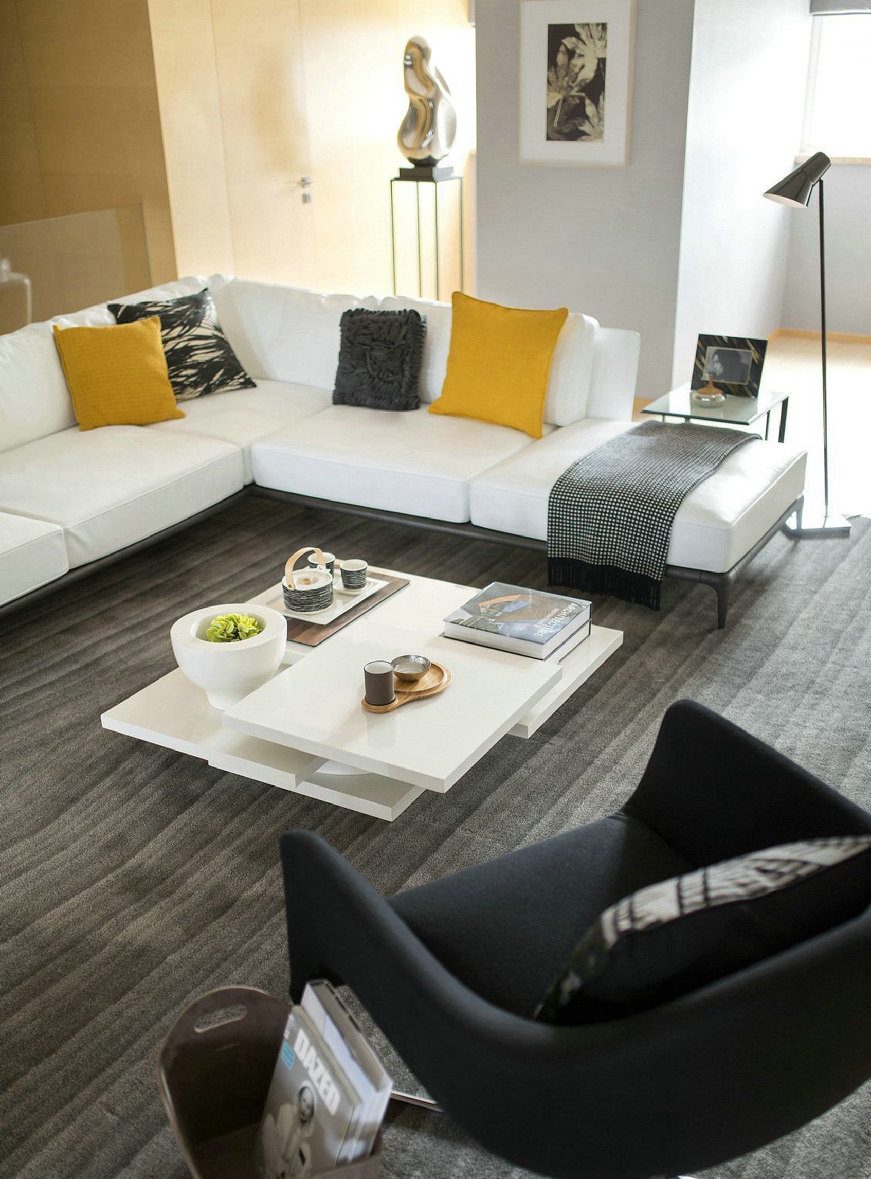 白色沙发搭配黄色、深灰色抱枕,为空间赋予的明亮轻快的氛围,