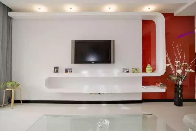 ▲电视背景墙Z型的线条设计,既可收纳又起装饰作用。