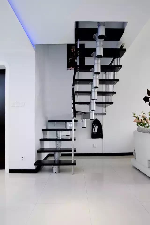 两段式的钢结构楼梯,好看又简单。同时楼梯底下也是收纳和装饰的空间,空间利用率大大增加。