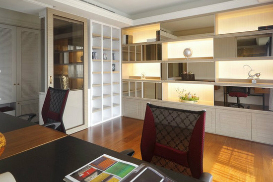考虑到男主人一回家就可以继续工作的习惯,书房设为入门即可入,设计了茶镜段落是为了缓和这份紧凑,透视着书房的景深。