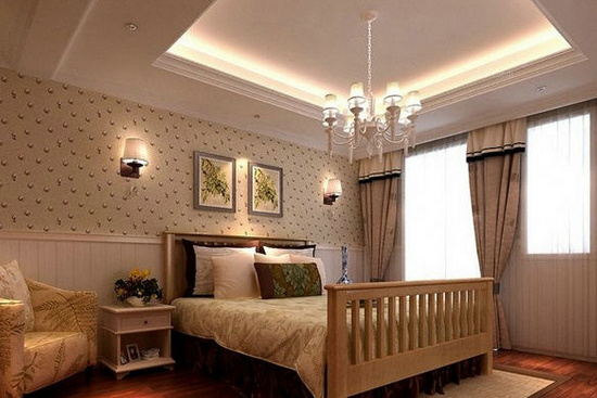 这套美式乡村田园风格的卧室装修屋顶板采用了别具一格的梯形挖空设计,与欧式风格的吊灯相得益彰,给人以宽敞舒适的感受,床头后方则运用了加以立体感的金色椭球形壁纸,其上清新的油画和精致的床头灯,更是营造出了无法言喻的浪漫温馨氛围。而床尾处的一木质栏杆画龙点睛,不觉中增添了家的韵味。房间的整体设计浪漫大气,温暖干净的色调更是令人身心舒泰。