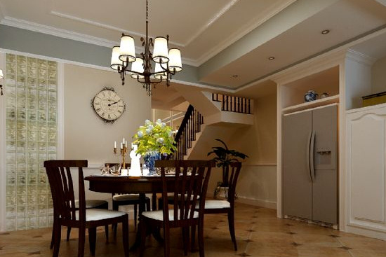 餐厅的装修设计带给我们的是一种清幽之感,内嵌墙面的冰箱美观而不呆板,旁边的收纳储物柜既可以放置书籍,也可以放置摆件,用以提升空间的艺术感,欧式仿古风格的地面瓷砖拼花,将空间营造出淡淡的温馨与浪漫的情调,而欧式的实木餐厅桌与椅子,呈现出低调的奢华气息。