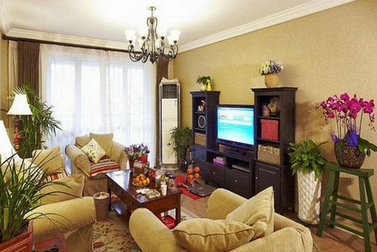 客厅的主调色是暖洋洋的米黄色,带给人一种幸福享受感。室内花花草草的装饰可以带来清新空气,土黄色的地板和墙面相呼应,简约不失时尚的吊灯使整间屋子更加明亮,采光位置也比较好,室内摆设温馨气氛浓厚,让人觉得舒适大方。