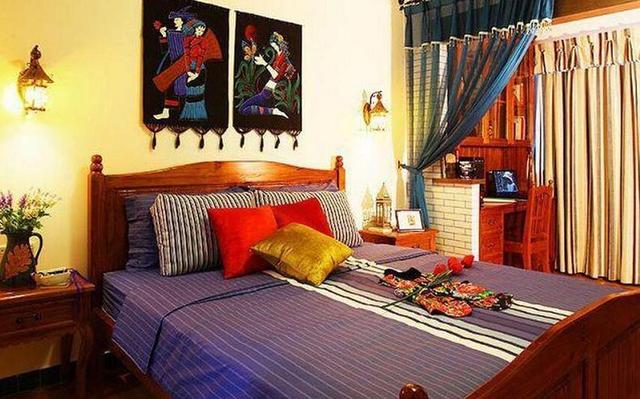 卧室以浅色调为主,加上各种暖黄色的灯光渲染,使这里看上去格外温暖。棕色大床搭配配套的床头柜以及两个小壁灯,简单的设置让这里看上去格外温馨。墙面上挂了两幅民族风刺绣画,非常漂亮。