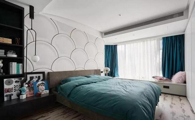 这里还设置了飘窗,旁边打造了蓝灰色书柜,平时可以坐在上面看书、眺望远方的风景。