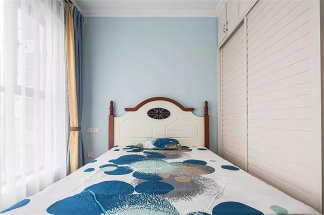 ▲儿童房也是蓝白调的空间,木质+白色的床头,布置一套蓝点的床单,整体显得优雅而又童趣活力。