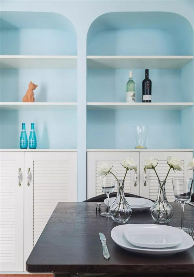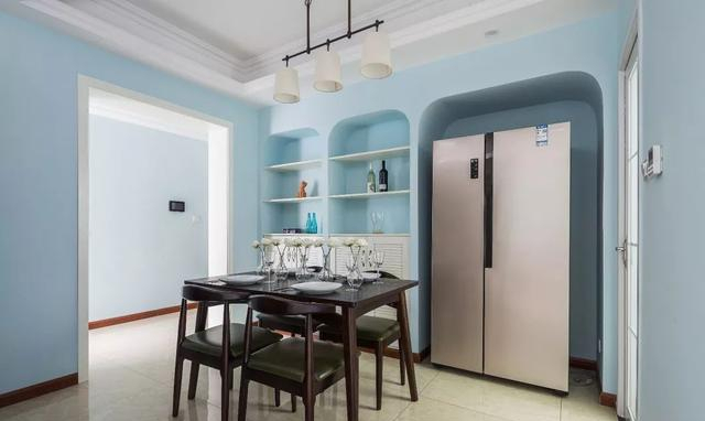 ▲餐厅空间也是以淡蓝色的空间基础,中间摆上一套端庄成熟的餐桌,而侧边的餐边柜顶部也装了几层的隔板,一侧留了一个双门大冰箱的摆放位置,整体拱形的入墙式造型,显得优雅而大气。