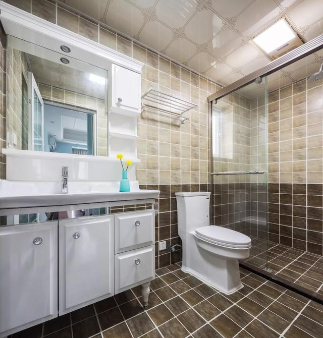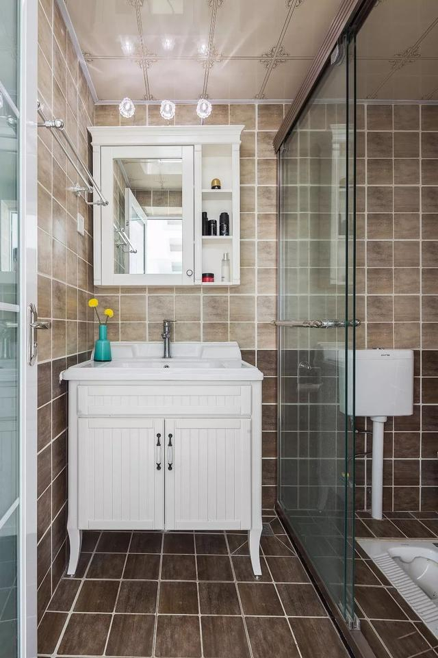 ▲紧凑的客卫,把蹲坑装在淋浴房里面,玻璃隔断的干湿分离格局,在深棕色地面+咖色墙面的搭配,呈现出一个端庄实用的卫浴空间。