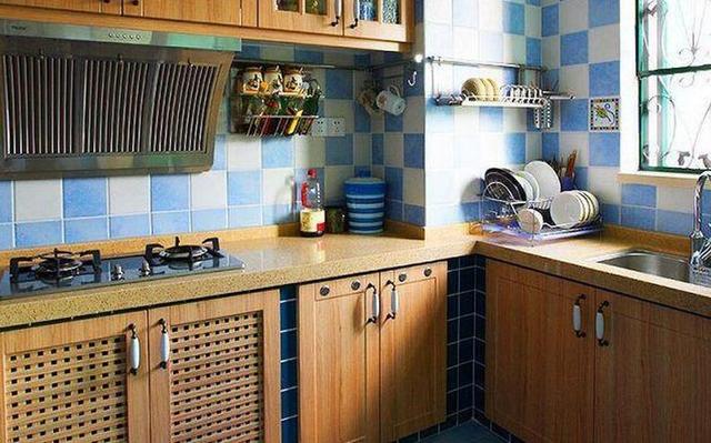 厨房里设置了L型橱柜,将转角空间充分的利用起来。墙面上铺设了蓝白小瓷砖,看上去非常干净清爽。