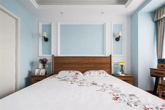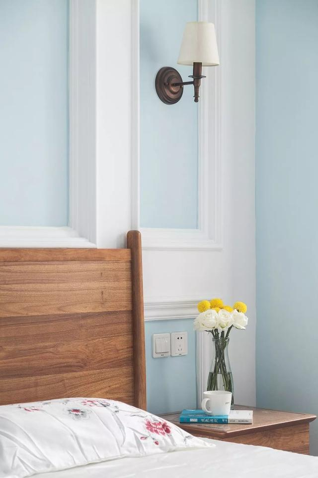 ▲卧室也是蓝白色调的空间,床头背景墙加入了边框造型,两侧还挂了古典范的壁灯,两侧搭配上木质床头柜,摆上鲜花、照片与茶杯,显得清新而又惬意。