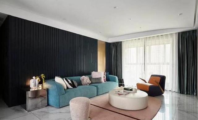 客厅里地面上铺设了大理石地砖,再加上精心布置的软装,非常温馨舒适。蓝色布艺沙发搭配黑色背景墙面,沉稳而又不失清新的格调。