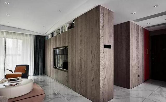 对面的电视墙采用了深灰色木制材料进行打造,中间将电视嵌入进去,整体墙面看上去更加干净简洁。