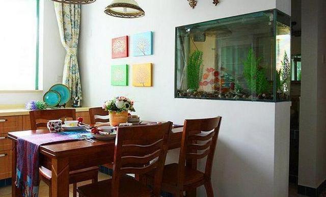 餐厅位于客厅的旁边,墙面中间凿出了一个空间,放置了一个鱼缸。上方挂置了复古造型的挂钟以及壁灯,为这里带来更多复古的韵味。四人坐的长条形原木餐桌及餐椅靠墙摆放,留出了充足的活动空间。窗前摆放了一个餐边柜,丰富这里的储物功能。