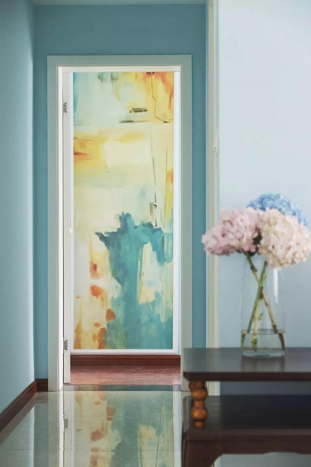 ▲走廊尽头是卧室门,门后墙面一整面的抽象壁画,打开卧室门后带来的是一个独特的艺术视觉。