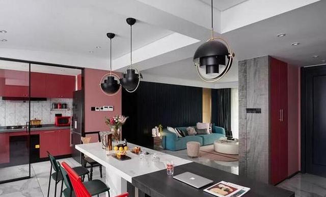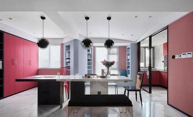 长条形黑白拼接餐桌简约时尚,搭配墨绿色以及大红色餐椅,极大的增加了空间的时尚感。三盏黑色吊灯美观实用,与整体风格保持一致。