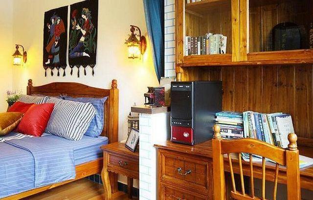 外面的阳台被设计师充分的利用起来,打造成了学习工作区,与室内之间设置了一个小小的半墙作为简单的隔断,工作台和室内之间还安装了纱帘,用于遮挡强光,非常贴心。