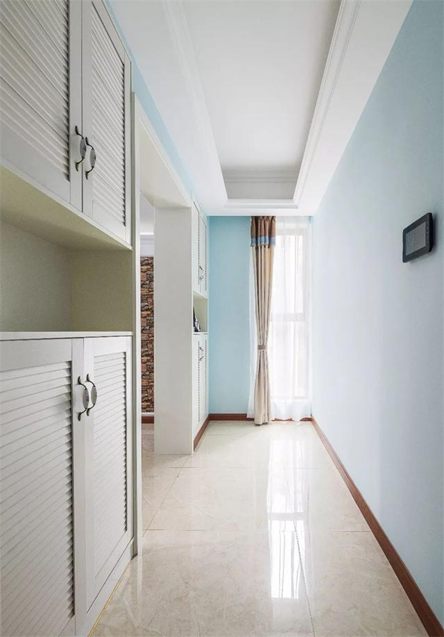 ▲原本户型是一进门右侧是餐厅的,为满足主人的储物需求,在进门后以收纳柜围出了一个独立的玄关,增加了空间的私密性,同时又让空间利用更加精致。在淡蓝色的墙面基础,呈现出一个清新雅致的氛围感。