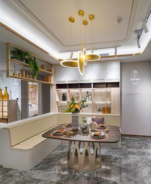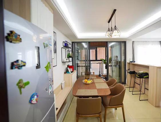 餐边柜+卡座,绕着墙贴边的设计,一面墙是卡座,一面墙是餐边柜,这样即可以收纳更多物品,而且真的可以坐很多人。