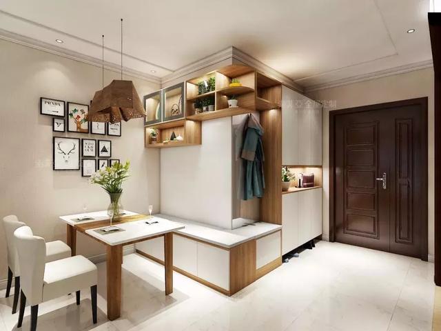 也有一些特殊的户型,进门旁边是一个L型转角,可以设计成一面墙是入户柜,一面墙是卡座,这样设计,转角位能容纳多一个人。