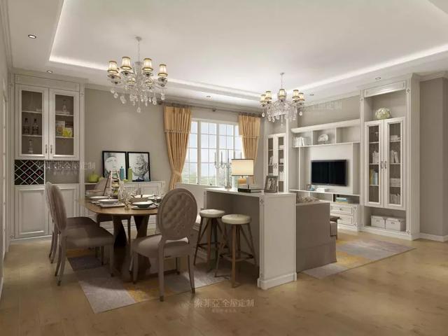 如果家里是开放式厨房,且客餐厅连在一起,可以在沙发背后做一个卡座餐椅,当作餐椅的同时形成空间隔断,这样在把区域分隔开的同时也不会很生硬。