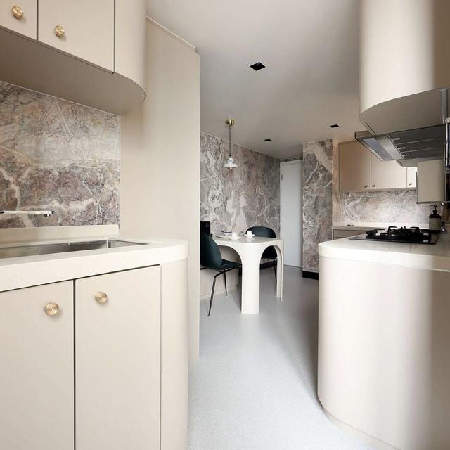 顺着墙体动线,安装定制橱柜,增大收纳空间,将那些瓶瓶罐罐的调料、锅碗瓢盆都藏起来,保持空间整洁。