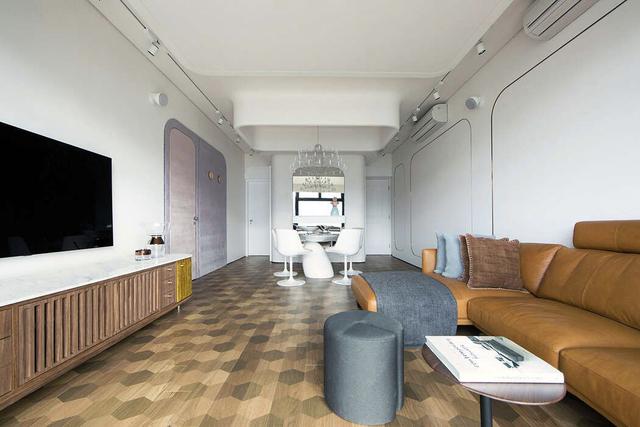 电视柜为了更贴合空间调性,选择了有竖条装饰的款式,与墙面的圆角矩形、地面的六边形图案的木地板相互呼应。撞色设计,给空间增添一抹活力。