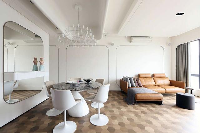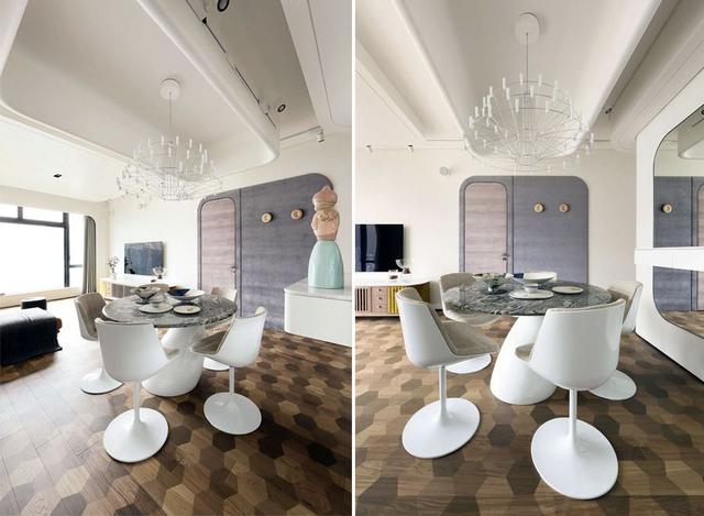 靠近用餐区的一面,安装了大镜子,镜子映照出客餐厅的影像,起到放大空间的作用。