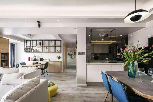 新房装修,在装地板时,往往会铺木地板瓷砖大理石等,这些材质质感不同,风格不同,给人的感觉也不同,所以很适合用在客餐厅一体化的设计中,通过两种不同材质的拼接来区分两个空间,效果很明显。