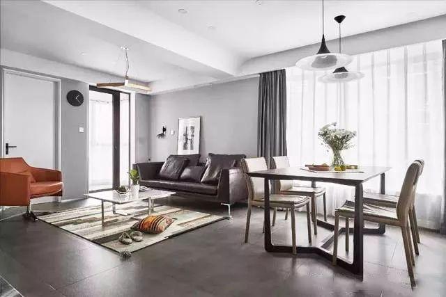 ▼若是不想在地面材质上花心思,也可以选择用地毯来区分客餐厅。地毯不仅具有极高的装饰性效果,而且它还有很明显的边界感,你可以选择放在沙发茶几下面,也可以选择铺在餐桌餐椅下面,但从方便程度上来说,前者是更好的选择。