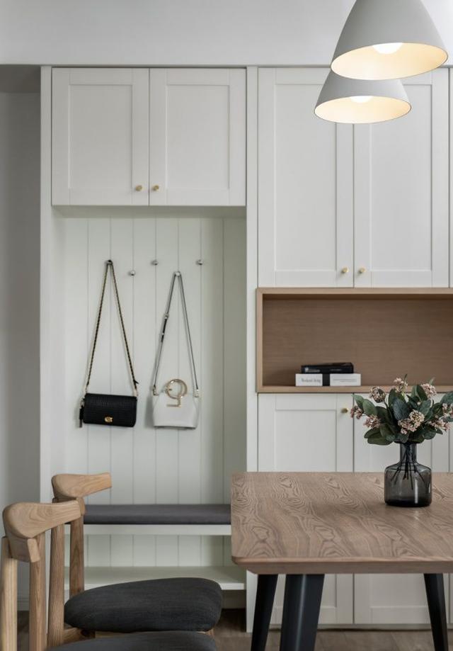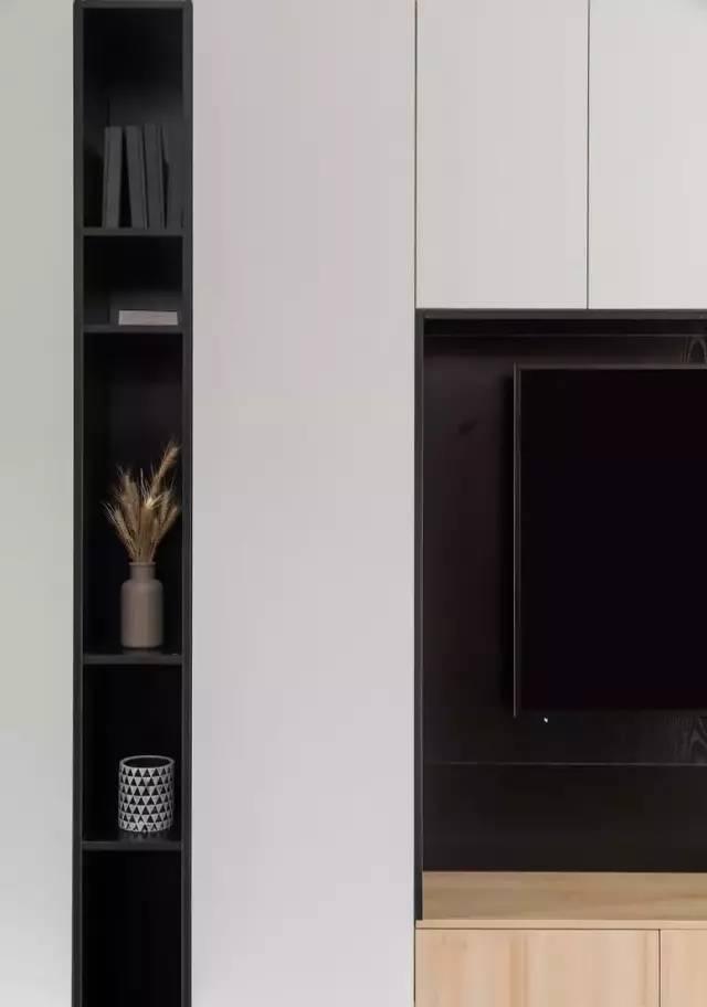 ▲ 一整面墙的储物柜充分满足屋主的收纳需求,部分留空的设计便于常用物品的取放,视觉面积上也更大更开阔。