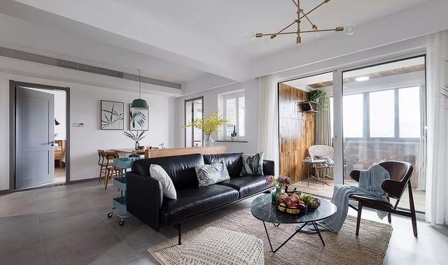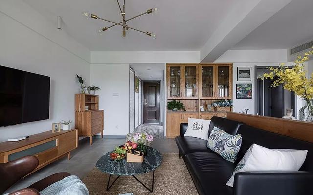 ▲ 黑色皮质沙发压住气场,与周围的原木色搭配,形成一种别样的美感。