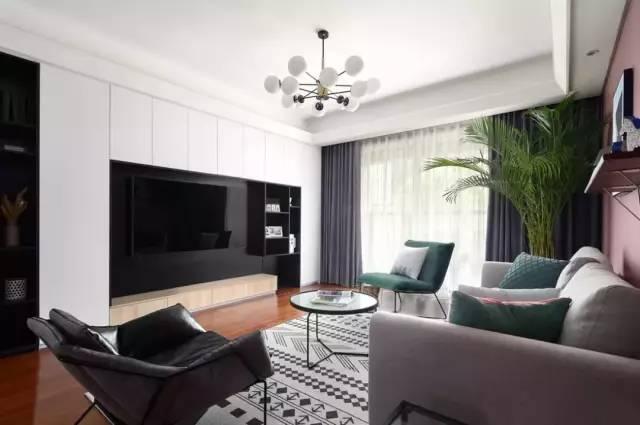 地毯采用了灰白色几何图案,增强了空间层次感。沙发背景墙采用了烟粉色,适应目前的流行趋势,有一种高级感。搭配简约的布艺沙发,充满格调。