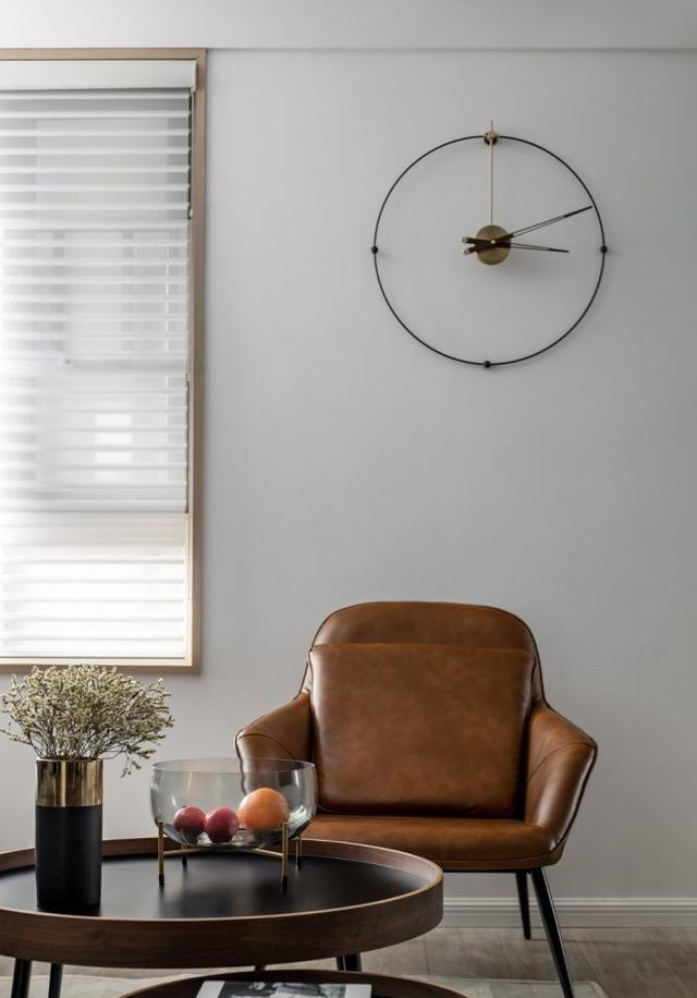▲ 优雅而舒适的棕色皮质单人沙发颇具艺术感,墙面简约不失精致的造型壁钟,为空间增添了轻盈灵动之感。