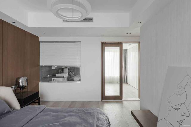 一层门不够,我们还可以多做几层门。比如在卫生间门所在的墙面上做定制衣柜,并在衣柜中间预留出卫生间入口的位置。这样衣柜一道门,卫生间一道门,基本上卫生间门对着床的问题,也就解决的差不多了。